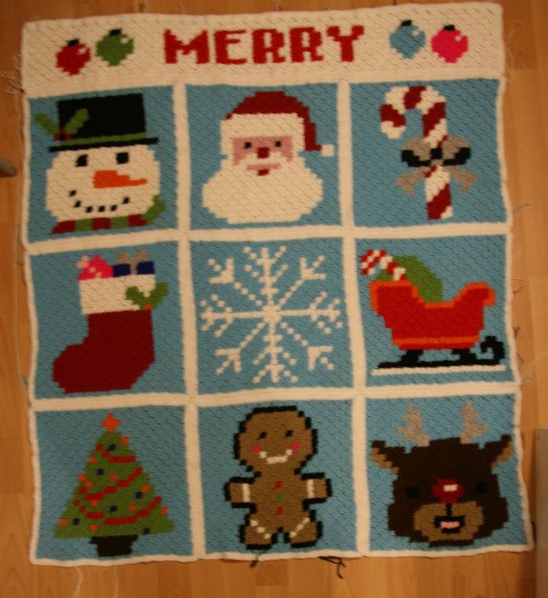 De kerstdeken is bijna klaar. De sierranden rond alle plaatjes en de bovenste banners zijn klaar. Alleen rond de onderste CHRISTMAS banner moet nog een sierrand. Dan zit de hele deken in elkaar.
