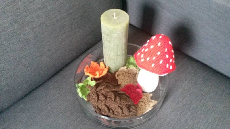 Alle onderdelen leuk in een glazen schaal neergezet met een kaars erbij. Toch was mijn herfststuk nog niet compleet. Er is nog een bewoner bijgekomen, namelijk een mini-uiltje. Dit patroon komt van 1 van mijn 2 favoriete haakblogs, repeatcrafterme.com. De maker van dit blog heeft ook het patroon van de kerstdeken gemaakt.