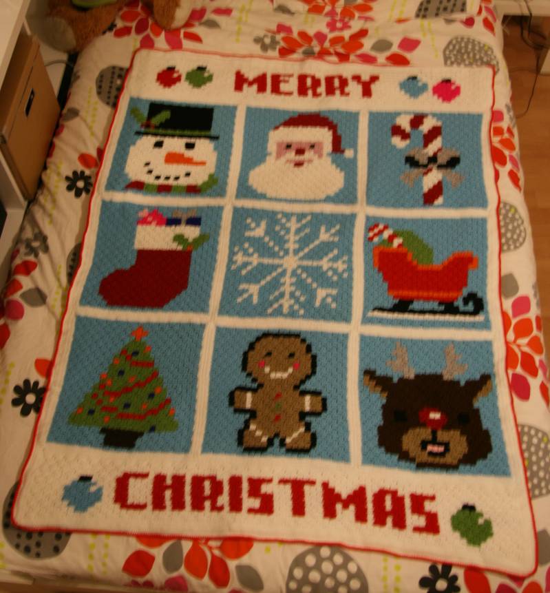 Hij is klaar!! Na veel te veel uren is mijn kerstdeken eindelijk af. Hij is zo fout, dat het maar goed is dat ie na kerst de kast in kan.